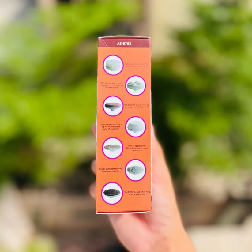 7 Functions in 1 Device – Includes different heads for callus removal, exfoliation, cleansing, and massage.